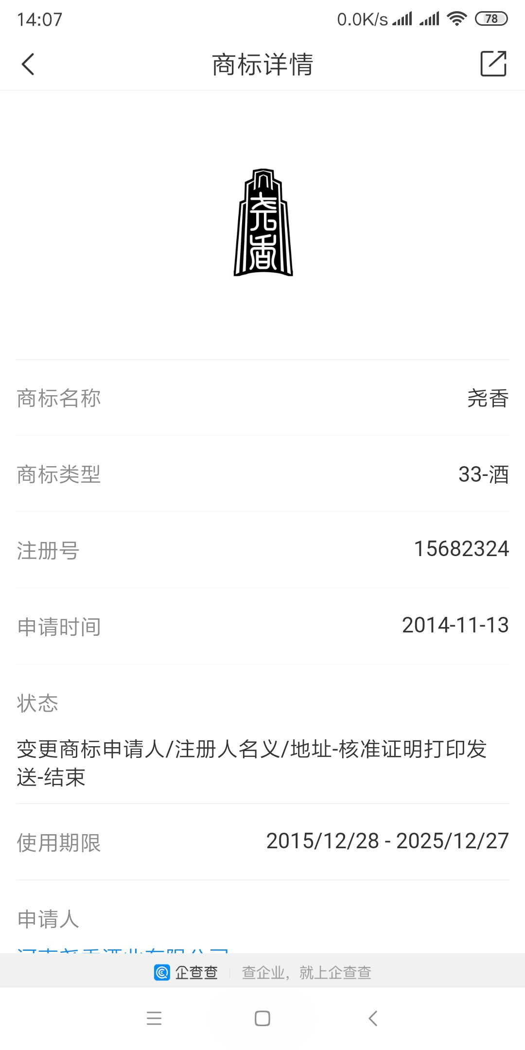 尧香酒商标,图片来源于企查查APP