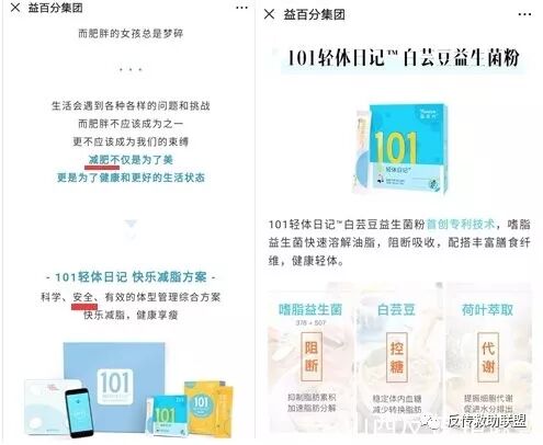 记者在“益百分”官方公众号发现,其减肥产品“101轻体日记” 宣传语显示,“益百分”的益生菌产品具有减脂功效,并强调“安全”、“有效”等特点。