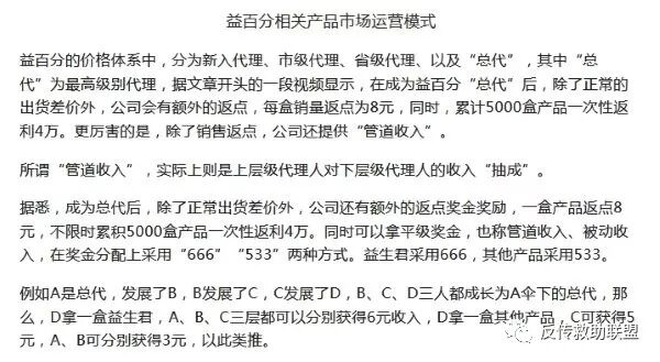据某“益百分”代理透露,要成为“市级经销商”,需要一次性“拿货”满16200元,而要做“总经销商”或“省级经销商”,都首先需要成为“市级经销商”,此后逐步晋级。