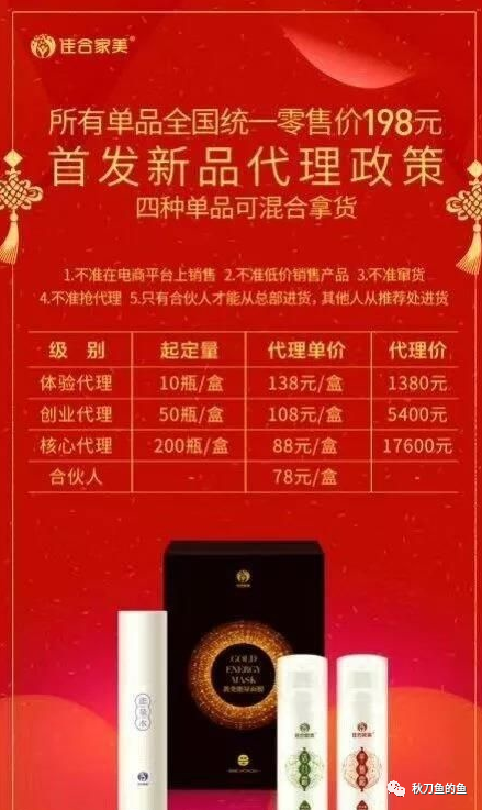 同时网络上一些宣传效果夸张的美文也是铺天盖地,“坚持每天涂抹“佳合家美”活力霜。直到3个月后,当我快把涂抹活力霜这件事当成吃饭睡觉一样寻常时,惊奇的发现,过去的几周里,我竟从没睡过一个懒觉,每天都是活力满满的第一个到达公司,纵使前一天晚上加班,第二天也不会那么疲惫。”佳合家美活力霜传销