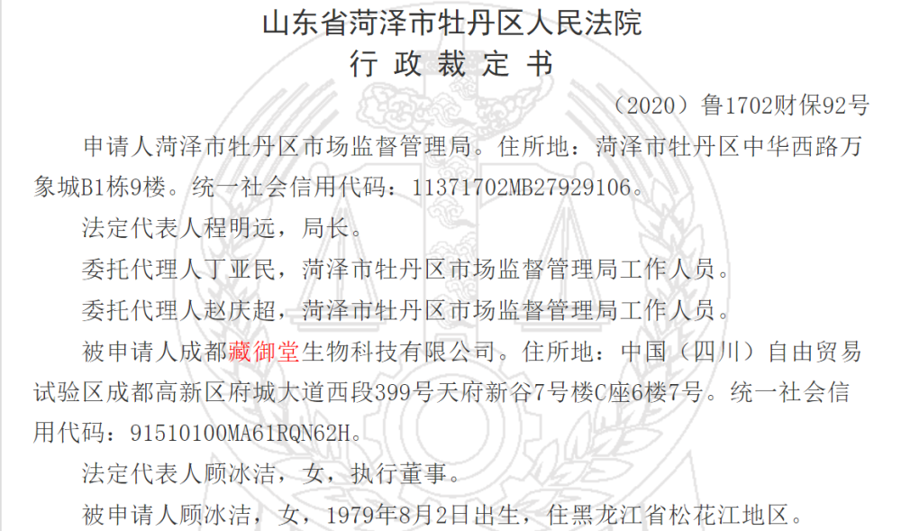 中国网财经10月3日讯(记者肖飞)据中国裁判文书网日前披露的一则行政裁定书,成都藏御堂生物科技有限公司(以下简称“成都藏御堂生物”)因涉嫌传销,被山东省菏泽市牡丹区市场监管局查处,为防止转移或者隐匿违法资金,牡丹区市场监督管理局向法院申请冻结该公司及25位涉案自然人在金融机构的存款、理财、期货等财产,这一申请得到了法院的支持。