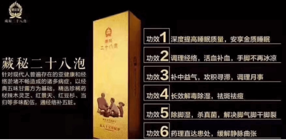 公开资料显示,成都藏御堂生物旗下主要产品为“藏秘二十八泡”,该产品宣称“是一款纯中草药制成的养生浴足产品,由辣木、灵芝、红景天、红豆杉等二十多种名贵中草药独家研制而成;每天用它泡脚,就能帮您改善手脚冰凉、脚气、脚臭、寒湿等现象,还能有效缓解失眠”。成都藏御堂传销