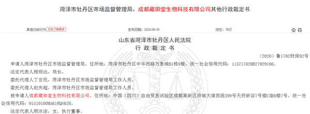 菏泽市牡丹区市场监督管理局、成都藏御堂生物科技有限公司其他行政裁定书