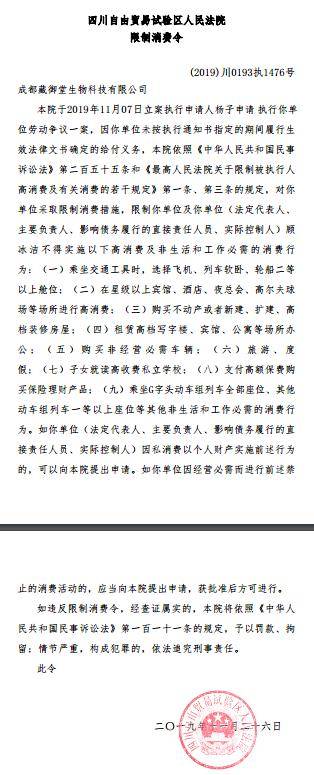 2019年11月7日,成都藏御堂被列入“失信人”“被执行人”“限制高消费”。被执行标的为71356元,法定代表人顾冰洁被限制消费。成都藏御堂传销