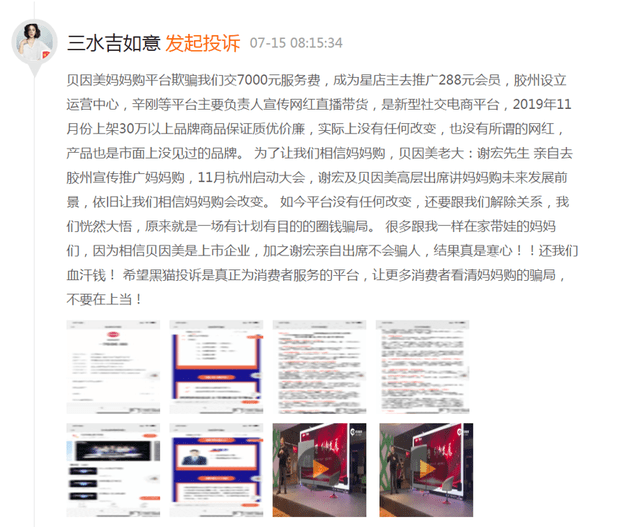 另一投诉人也称,“贝因美妈妈购平台欺骗我们交7000元服务费,成为星店店主去推广288元妈妈购Plus会员,在胶州设立运营中心,辛刚等平台主要负责人宣传网红直播带货,还称2019年11月上架30万以上品牌商品,保证质优价廉,实际上没有任何改变,也没有所谓的网红,产品也是市面上没见过的品牌。”