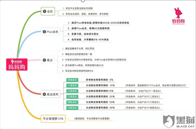妈妈购“星店”体系共分为会员、Plus会员、星店、星店返利、平台管理费五部分。其中,普通会员缴纳288元可升级为Plus会员,之后推荐Plus会员入会,可获得80元销售利润。如果缴纳6000元或7000元成为“星店”店主,则店内新增Plus粉丝,可获得补贴50元,同时享受店内粉丝的销售利润。而最终导致“星店”项目涉嫌传销的,正是其返利模式。