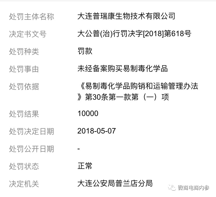 然而在2018年,大连普瑞康生物技术有限公司因为未经备案购买易制毒化学品的行为,受到大连公安局普兰店分局罚款1万元的行政处罚。