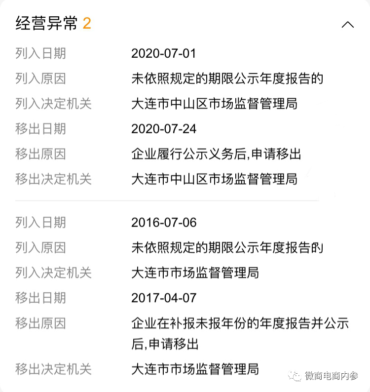 同时,由他担任法人的大连康源投资有限公司,曾两次因为未按照规定的期限公示年度报告被列入企业经营异常名单。