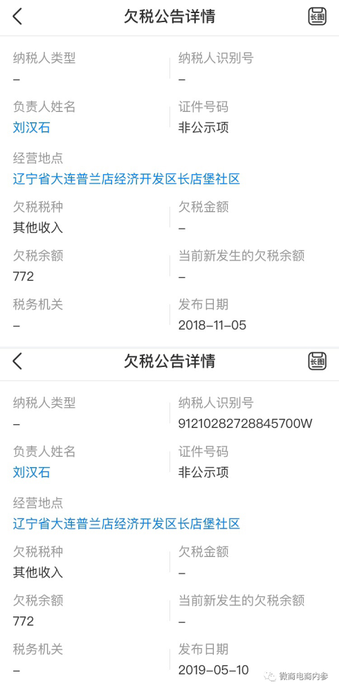 除此之外,根据天眼查资料显示,在2018年和2019年连续两年,均发布了以刘汉石为负责人的欠税公告。