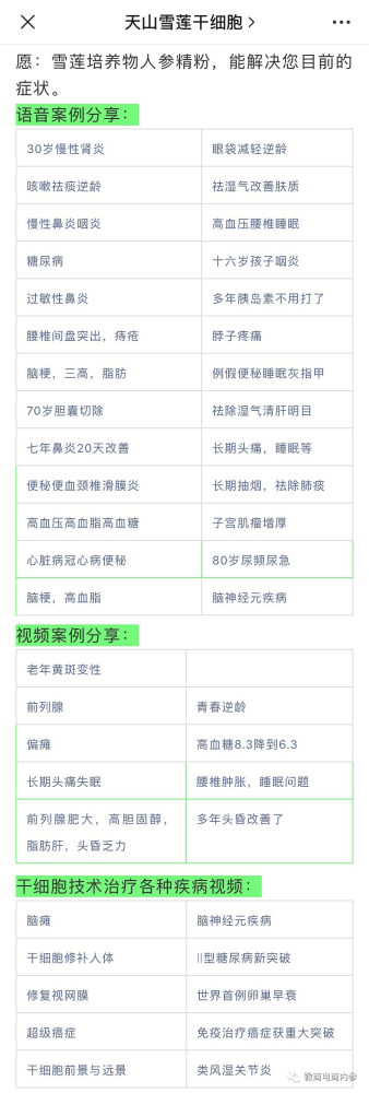 而普瑞康的这款产品,就提出是全民都用得起的口服全能干细胞,在名为“天山雪莲干细胞”的公众号里,我们还能看到有一篇案例分享的文章,文章中以语音或者视频的形式,将各种治疗病例分门别类,小到头昏、鼻炎咽炎,大到糖尿病、脑梗、心脏病,这款人参精粉都能解决。