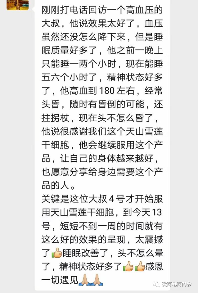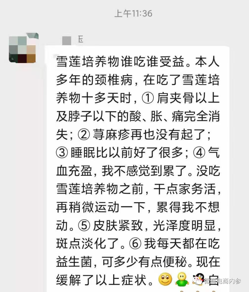 除此之外,在各个经销商的朋友圈里,也随时都在发表使用这款产品后的病例反馈:患者在服用雪莲培养物人参精粉十多天后,之前多年的颈椎病现在已经没有了酸胀痛的感觉;荨麻疹也没有再起;睡眠比以前好了很多;气血充盈,皮肤紧致,斑点也在淡化。
