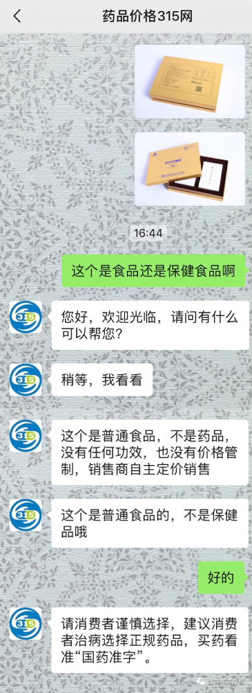 为了进一步取证,我们又到药品价格315网进行询问,对方给出的回复是:这款雪莲培养物人参精粉属于普通食品,而并不是保健品或者药品,没有任何功效,同时没有价格管制,由经销商自主定价销售,并建议消费者治病选择正规药品。普瑞康生物天山雪莲