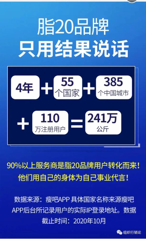 “脂20“自称科学减肥,由体脂监测,减脂教育以及营养餐相互结合的“模式,产品更是号称已经卖到了55个国家,385个城市,110万注册用户,4年时间内帮助44万人累计减脂241万公斤(2140吨),一位姓李的脂20董事服务商更是声称,年入百万不是梦,0费用,宝马随时开回家。该产品宣称邀请了张继科等多位奥运冠军代言,能够在短时间内健康快速的达到减肥的目的。单看这数据,不仅让人怀疑”脂20“是如何发展到这多注册会员的。
