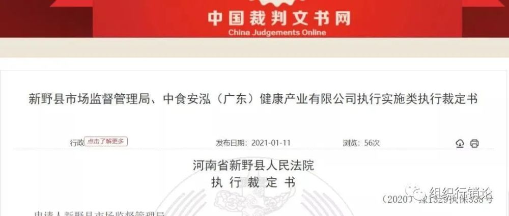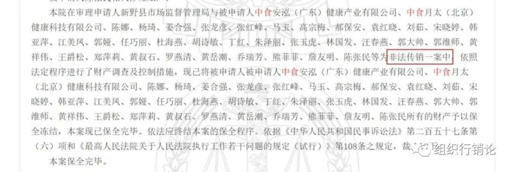 1月11日中国裁判文书网发布了一则题为《新野县市场监督管理局、中食安泓(广东)健康产业有限公司执行实施类执行裁定书》。该裁定书内容显示,新野县市场监督管理局以非法传销为由申请冻结中食安泓(广东)健康产业有限公司等36人的全部财产,法院对申请予以支持,依法冻结了上述36人的财产。