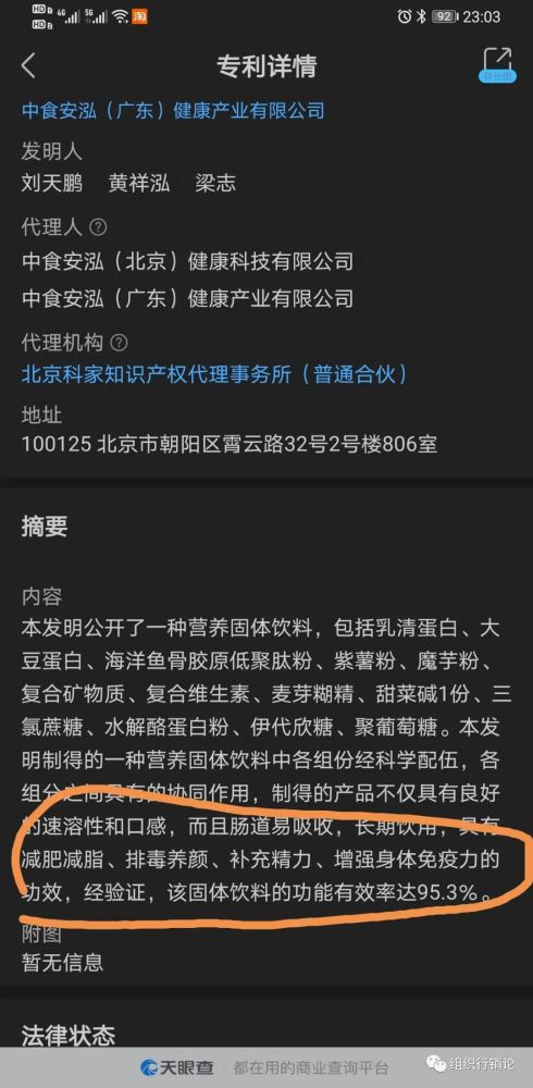 小编在天眼查了解《中食安泓(广东)健康产业有限公司》在2017年申请的一种固养固体饮料没有通过国家知识产权局,具有功力的效果是无法通过的,其明确内容有“减肥”字眼,只是一款固体饮料,连保健品都算不上。脂20传销