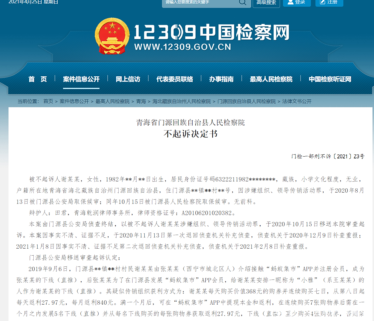 被不起诉人谢某某,女性,1982年**月**日出生,居民身份证号码6322211982********,藏族,小学文化程度,无业,户籍所在地青海省海北藏族自治州门源回族自治县,住门源县**镇**村**号,因涉嫌组织、领导传销活动罪,于2020年8月13日被门源县公安局取保候审;同年10月15日被门源县人民检察院取保候审。无前科。