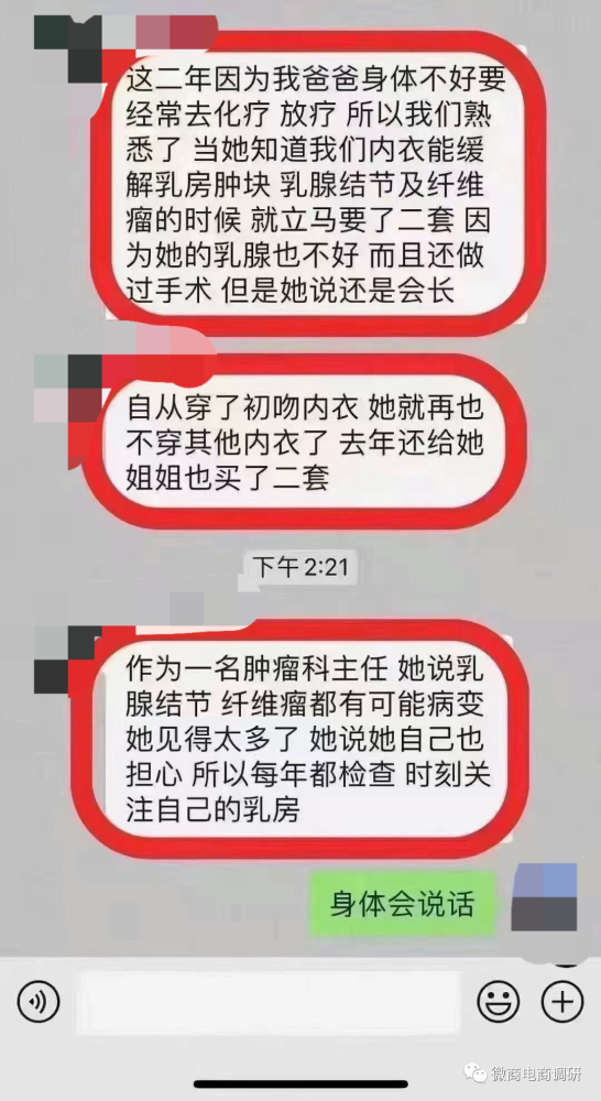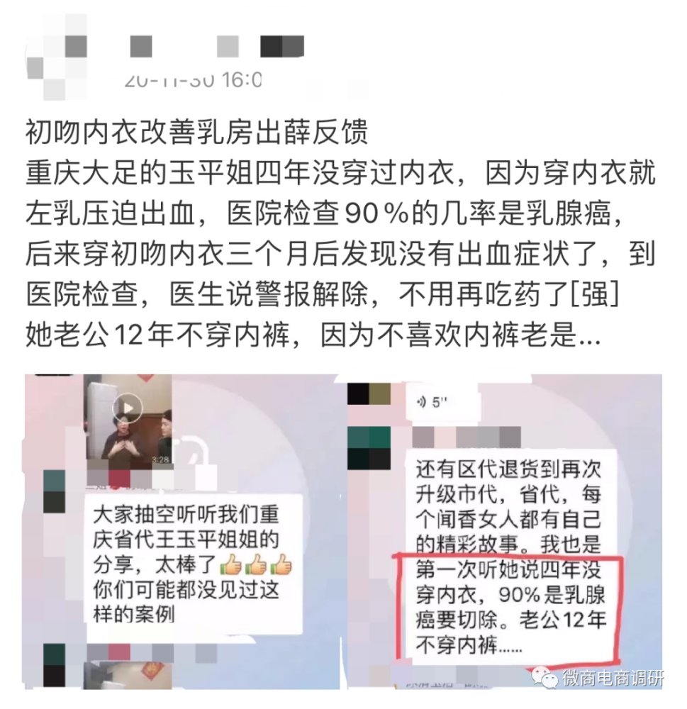 不仅如此,在经销商的推广资料里,初吻还被称之为是一款可以缓解乳腺增生、结节、疏通乳腺,远离乳腺疾病的健康内衣。甚至还有许多使用者的案例:作为一名肿瘤科主任,在知道初吻内衣能够缓解乳房肿块、乳腺结节以及纤维瘤的时候,立马就给自己和家人买了两套,并从此再也不穿其他品牌的内衣。