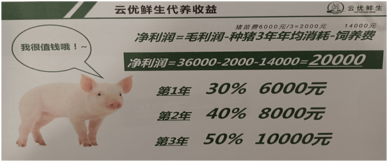 投资人以20000元为基数认购种母猪(猪苗费6000元,饲养费14000元),可认购一头或者多头。以一头为例,第一年收益30%即6000元,第二年40%收益即8000元,第三年50%收益即10000元。半年一结算。