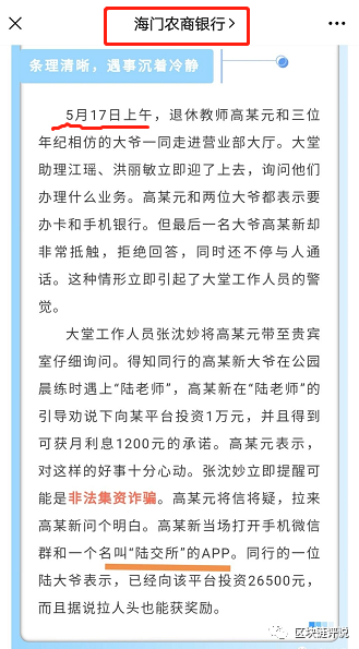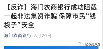 2021年5月20日,海门农商银行在其官方公众号发布了:【反诈】海门农商银行成功阻截一起非法集资诈骗 保障市民“钱袋子”安全”,其中报道了“陆羽茶交所”,银行人员提醒可能是非法集资诈骗。