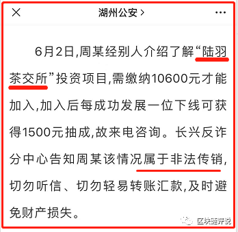 2021年6月2日,湖州公安在其官方微信公众号中发表了一篇“这周你被骗了吗?这张图很重要”,其中点名了“陆羽茶交所”,表示该情况属于非法传销,切勿听信、切勿轻易转账汇款,及时避免财产损失。