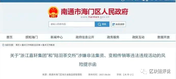 2021年6月4日,南通市海门区人民政府网站发布了“关于“浙江嘉轩集团”和“陆羽茶交所”涉嫌非法集资、变相传销等违法违规活动的风险提示函”。