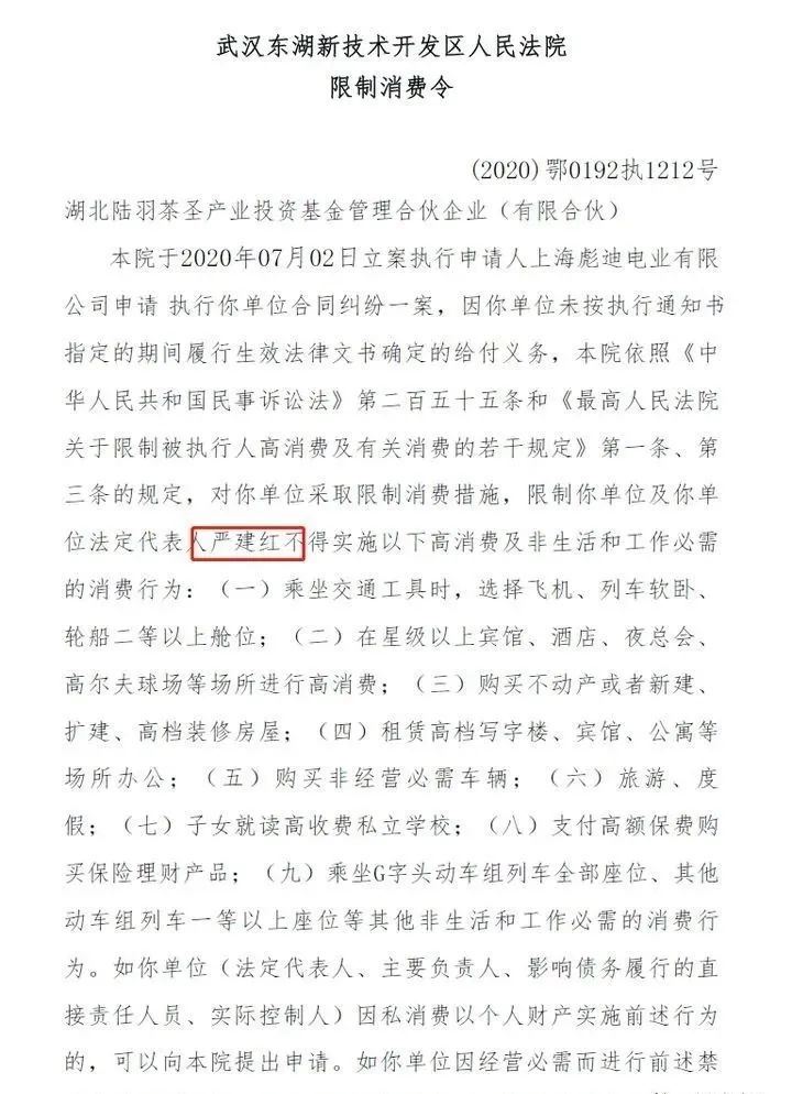 据了解,对严建红的限制消费令,缘起是的上海彪迪电业有限公司与深圳陆羽基金管理有限公司、湖北陆羽茶圣产业投资基金管理合伙企业(有限合伙)历时三年多的合同纠纷,涉及执行标的550多万元,原因为严建红因借款合同到期后长时间未归还。