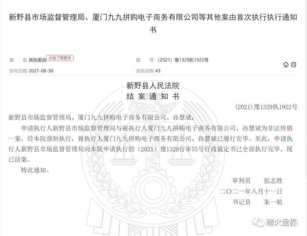 8月30日,中国裁判文书网公布一则题为《新野县市场监督管理局、厦门九九拼购电子商务有限公司等其他案由首次执行执行通知书》(简称:《执行通知书》)。