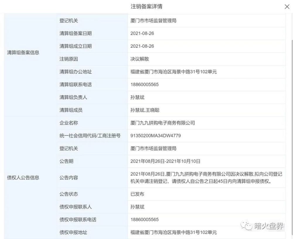 此外,据天眼查APP还显示,2021年08月26日,厦门九九拼购电子商务有限公司因决议解散,拟向公司登记机关申请注销登记,请债权人自公告之日起45日内向清算组申报债权
