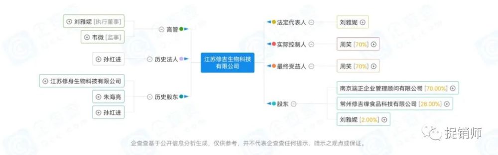 根据企查查APP数据显示,江苏修吉成立于2021年4月26日,法人刘某某持股2%;南京端正企业管理顾问有限公司持股70%;常州修吉缘食品科技有限公司持股28%。