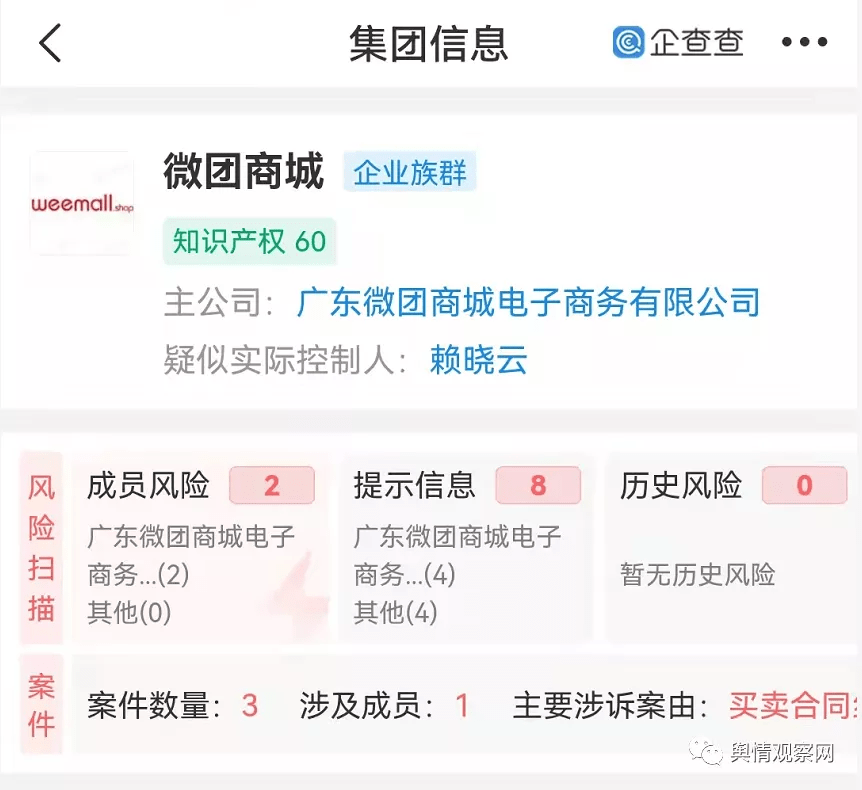 据企查查显示,东莞市旭远电子科技有限公司成立于2007年1月31日,注册资金588万元,赖晓云为公司法人代表、大股东及实际控制人,持有股份为100%。值得注意的是,赖晓云名下有33家公司,其中一家为广东微团商城电子商务有限公司,该公司名下有一家名为微团商城的APP。