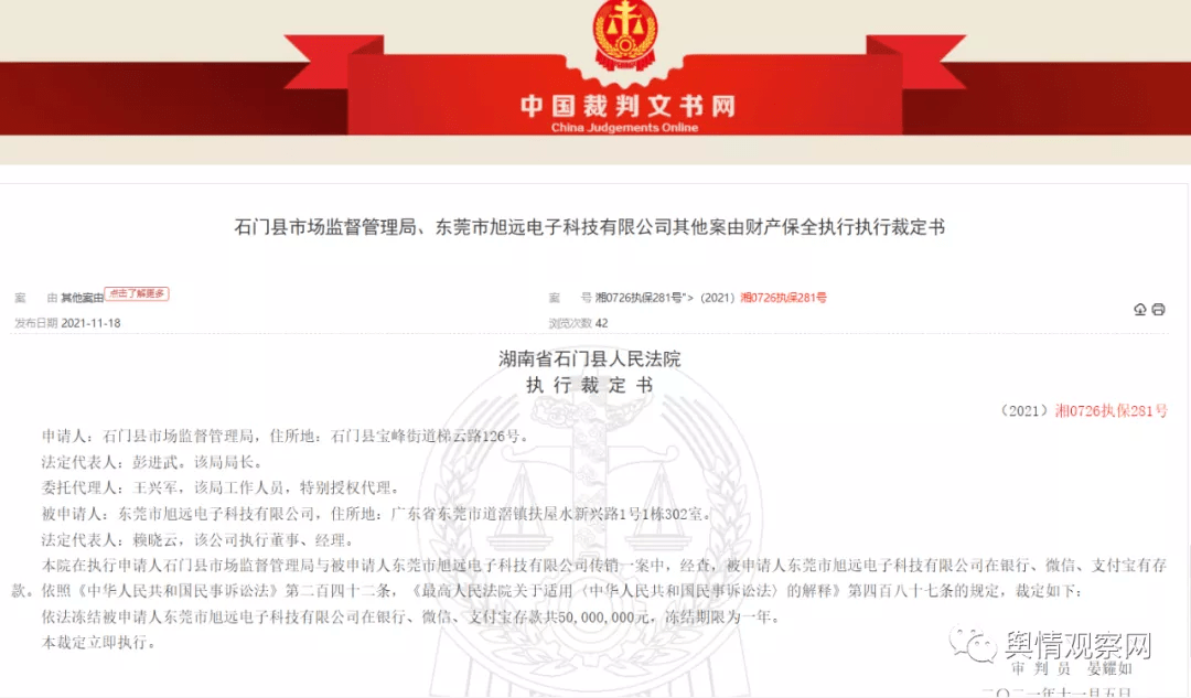 近日,在中国裁判文书网注意到案号分别为(2021)湘0726执保281号、(2021)湘0726执保282号、(2021)湘0726执保283号的财产保全执行裁定书,涉及东莞市旭远电子科技有限公司及相关人员因涉嫌传销累计被冻结账户1.5亿元。