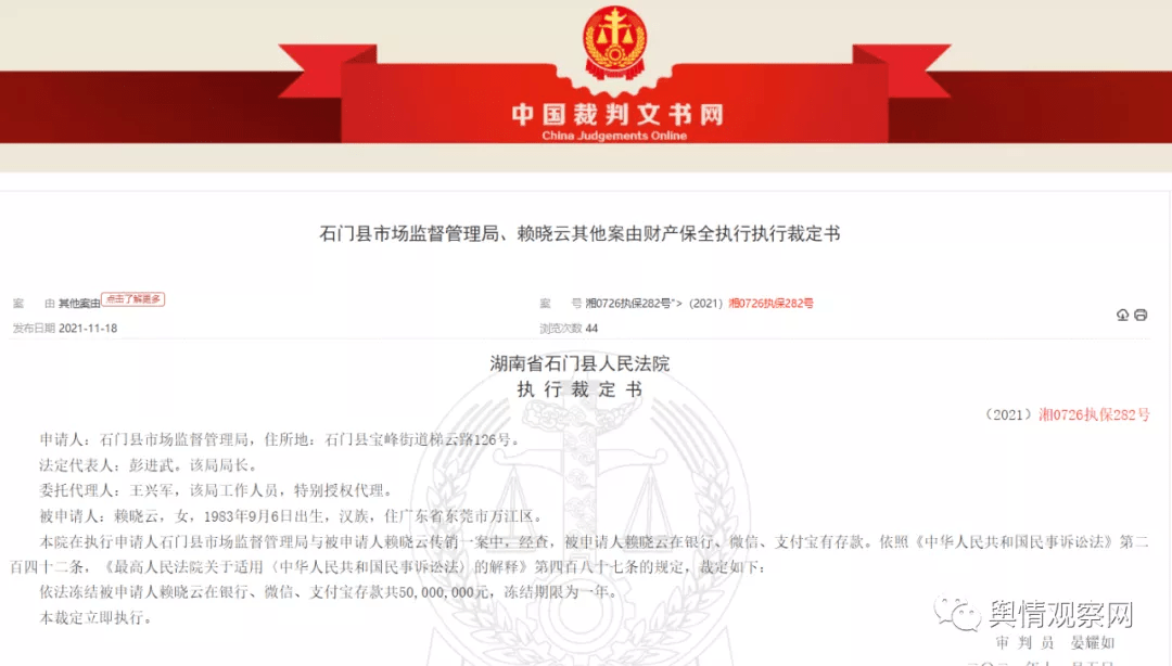 案号(2021)湘0726执保282号显示:本院在执行申请人石门县市场监督管理局与被申请人赖晓云传销一案中,经查,被申请人赖晓云在银行、微信、支付宝有存款。依照《中华人民共和国民事诉讼法》第二百四十二条,《最高人民法院关于适用〈中华人民共和国民事诉讼法〉的解释》第四百八十七条的规定,裁定如下:依法冻结被申请人赖晓云在银行、微信、支付宝存款共50,000,000元,冻结期限为一年。本裁定立即执行。