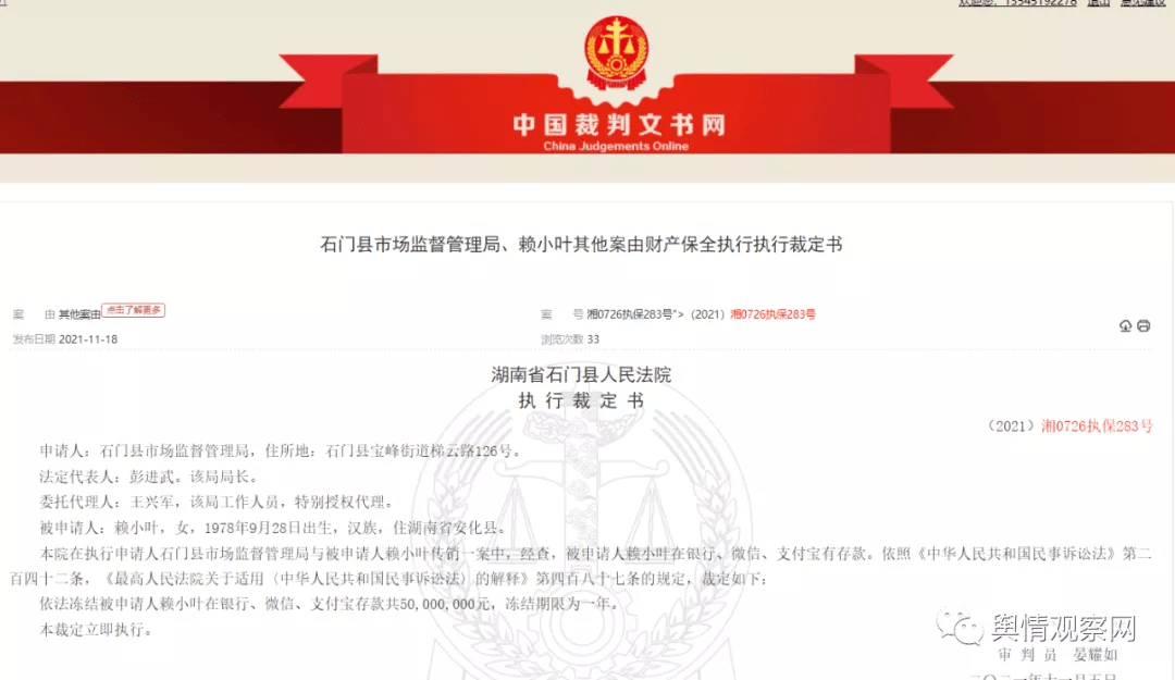 案号(2021)湘0726执保283号显示:本院在执行申请人石门县市场监督管理局与被申请人赖小叶传销一案中,经查,被申请人赖小叶在银行、微信、支付宝有存款。依照《中华人民共和国民事诉讼法》第二百四十二条,《最高人民法院关于适用〈中华人民共和国民事诉讼法〉的解释》第四百八十七条的规定,裁定如下:依法冻结被申请人赖小叶在银行、微信、支付宝存款共50,000,000元,冻结期限为一年。本裁定立即执行。