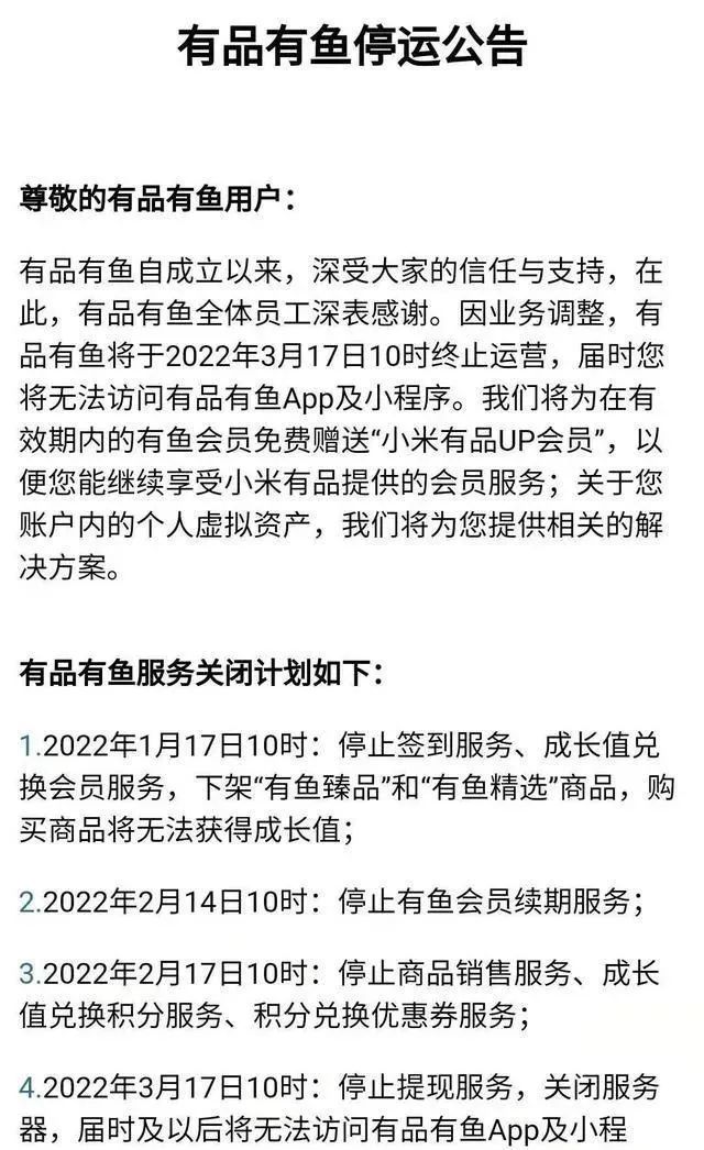 在公告中,有品有鱼表示,将为在有效期内的有鱼会员免费赠送“小米有品UP会员”,以便用户能继续享受小米有品提供的会员服务;关于用户账户内的个人虚拟资产,将提供相关的解决方案。