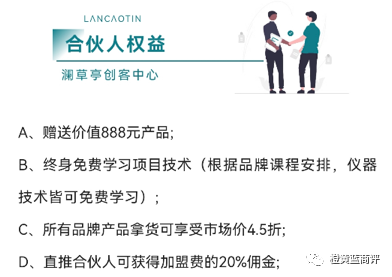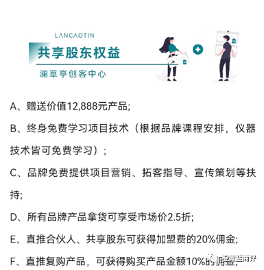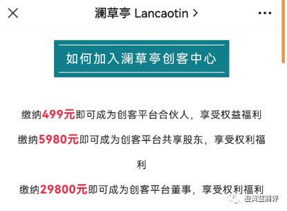 本网了解到,“澜草亭”现在有一个共享创客项目正在招商中,项目招商分为四档,合伙人,共享股东,董事,核心董事。