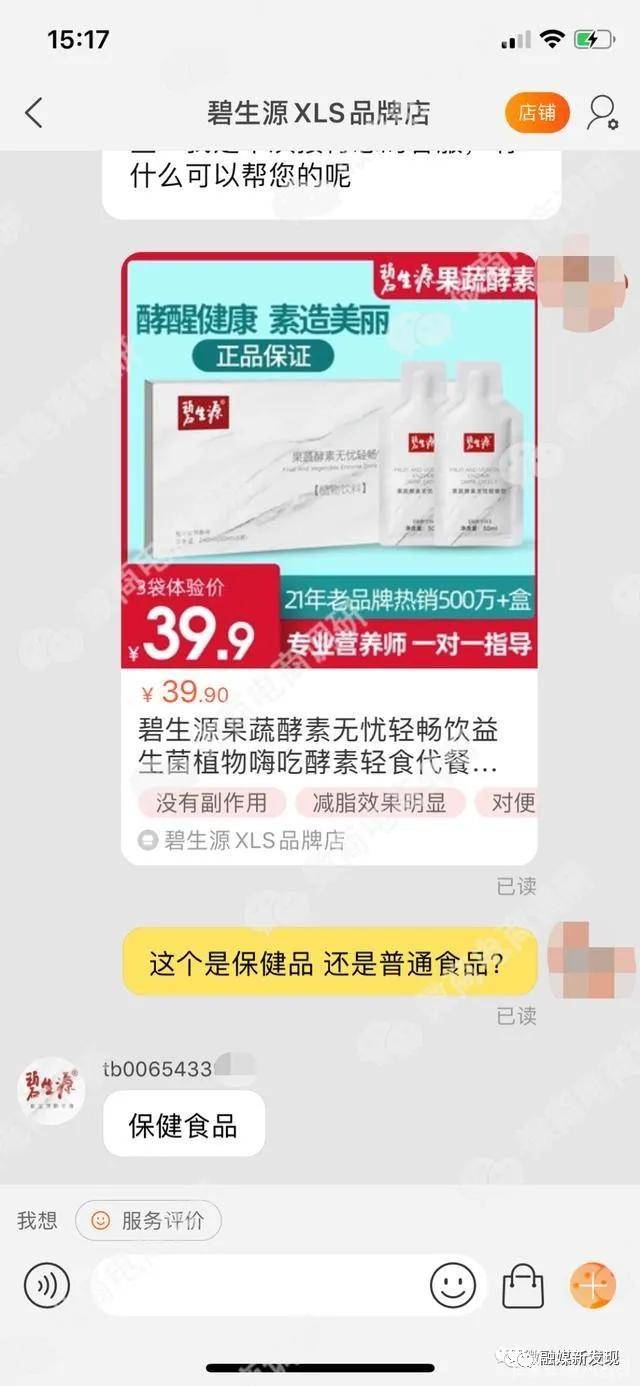 但是值得注意的是我们在咨询淘宝碧生源经销商碧生源果蔬酵素无忧亲畅饮是普通食品还是保健品时,淘宝经销商却还声称碧生源果蔬酵素无忧亲畅饮为保健品。