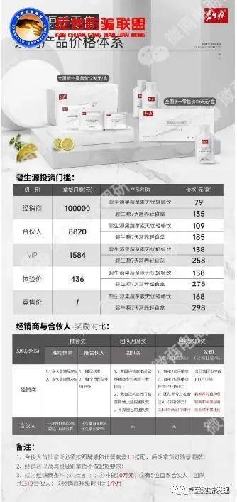 而让我们更值得注意的是,从经销商那提供的代理模式,明显的代理级别就有5层:零售价、体验价、VIP、合伙人、经销商,五个等级的拿货门槛和拿货价格各不相同,并且推荐合伙人还能获得奖励具体如下图: