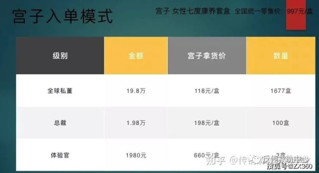 根据宫子代理商介绍:宫子模式号称七天回本,日赚过万,小白最低月入10万,两个月倍增,三个月裂变;宫子的入单模式分为三个级别,全球私董、总裁以及体验官,代理金额分别为:19.8万、1.98万以及1980元,拿货价分别为:118元/盒、198元/盒、660元/盒,最低数量为:1677盒、100盒、3盒。就拿全球私董级别来算:零售997元卖1套利润879元,10套利润8790元,100套利润87900元,1677套利润1474083元;私董(拿货价118)—总裁(拿货价198元)=每盒差价80元,招一个总裁:出100盒产品,100盒X80元=8000元,招十个总裁利润80000元。