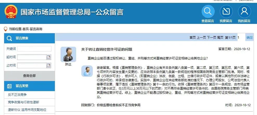 市场监管总局价格监督检查和反不正当竞争局在官网回复公众留言中表示,直销企业在未经商务部批准的情况下,办理公司股东、公司法定代表人等事项变更,属于违反《直销管理条例》的行为。综上,直销企业不能通过股权转让、重组、并购等方式将直销经营许可证变相转让给其他企业。海之圣经销商
